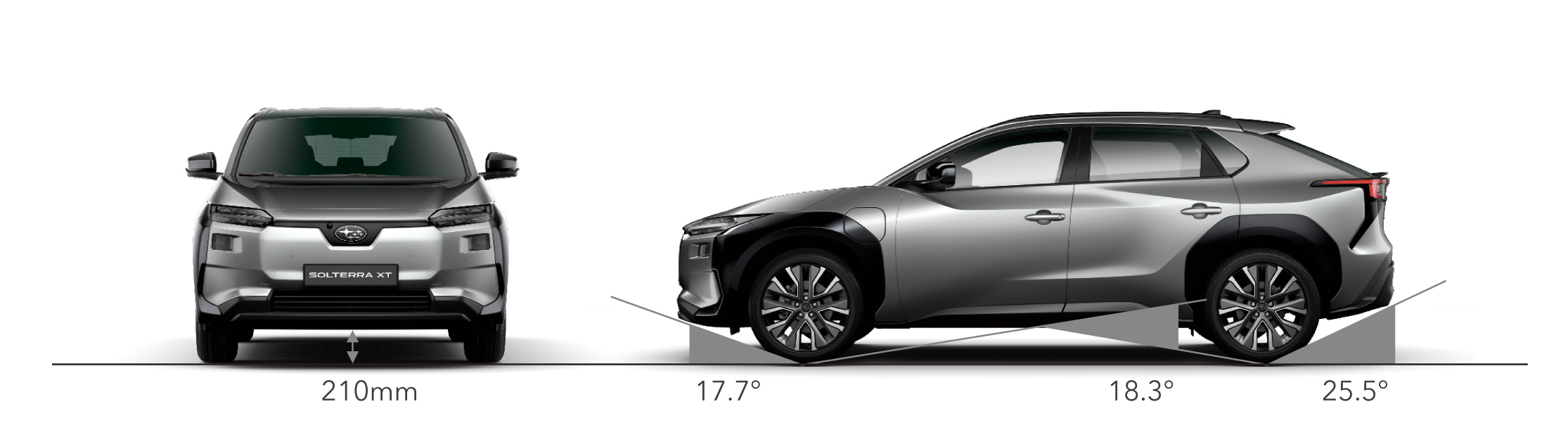 SOLTERRA XT是一款真正具備 SUV本格實力的車款,擁有足以應對崎嶇路況所需的離地高度。精密計算的接近角、離去角與穿越角,不僅強化越野能力,也有效保護車身結構與電池組,讓每一次冒險都更加安心。